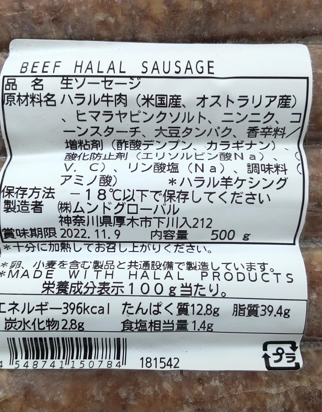 - Halal-certified beef (U.S., Australia), sheep intestine (halal), Himalayan rock salt, salt, garlic, cornstarch, soy protein, spices/ thickener (starch acetate, carrageenan), antioxidant (sodium erythorbate, V.C, phosphate (Na)), seasoning (amino acid)
